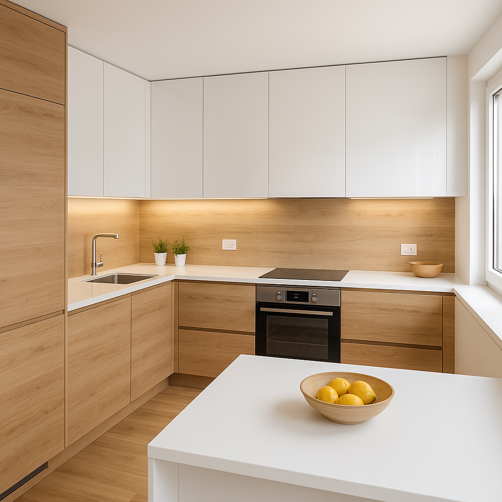 یکی از ترندهای محبوب سالهای اخیر، استفاده از ترکیب MDF براق سفید یا طوسی با MDF طرح چوب روشن است. این تضاد رنگی، هم حس گرما و طبیعت را به فضا میدهد و هم جلوهای مدرن و لوکس ایجاد میکند.